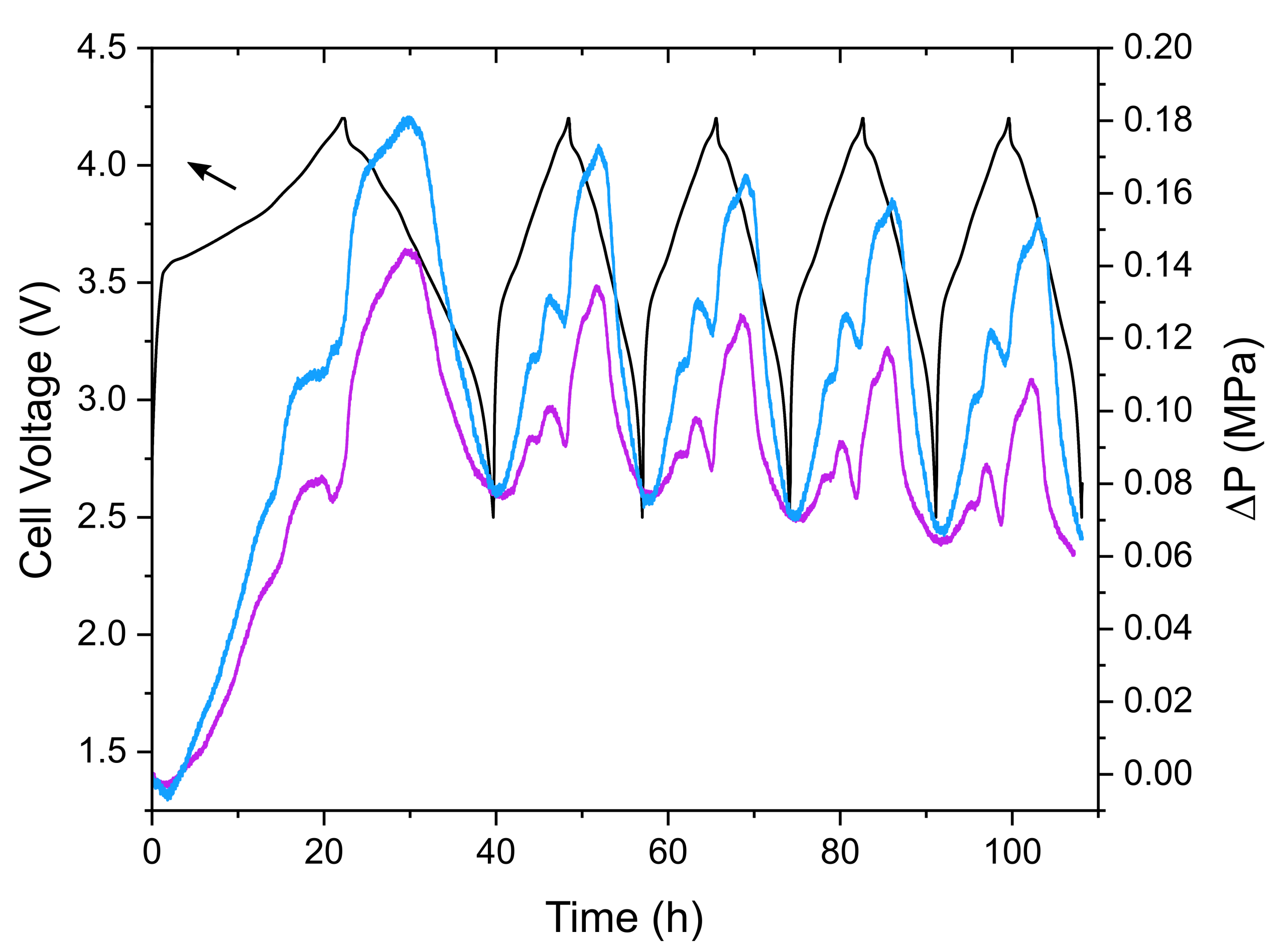 Evolution of cell voltage (black) and pressure variation (color) during the formation cycles of SiOx-graphite/NMC811 pocket cells with two different compositions at the negative electrode.